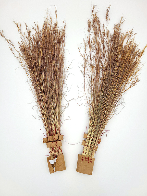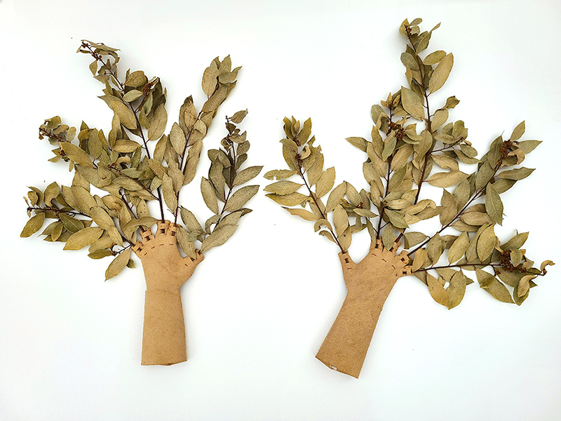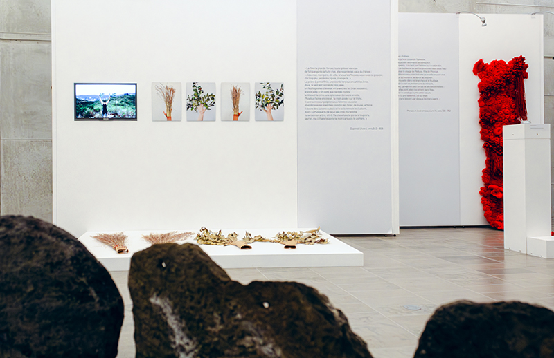 Exposition de la série des Gants à métamorphose (Laurier et Graminées) : sculptures, photographies et vidéos des performances Se dresser comme un arbre et Danser comme une herbe. Vidéo Full HD, tirage Fuji sur Dibond, sculptures-objets en cuir et végétaux.