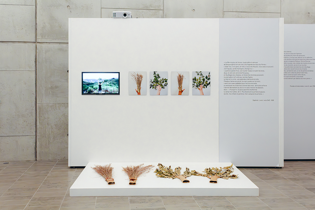 Exposition de la série des Gants à métamorphose (Laurier et Graminées) : sculptures, photographies et vidéos des performances Se dresser comme un arbre et Danser comme une herbe. Vidéo Full HD, tirage Fuji sur Dibond, sculptures-objets en cuir et végétaux.