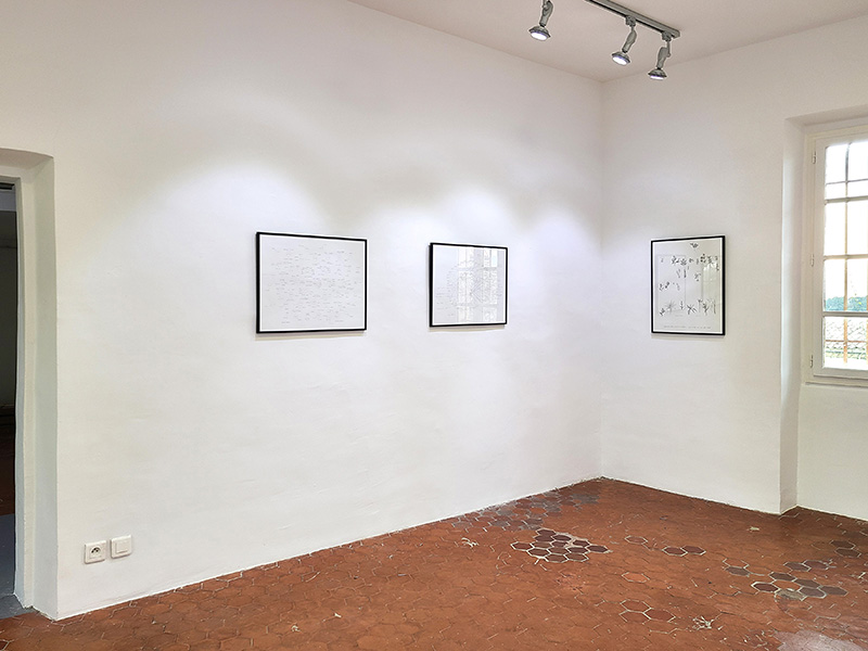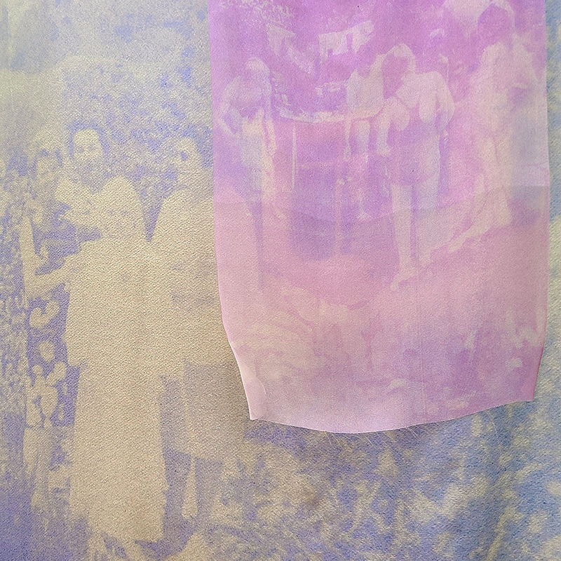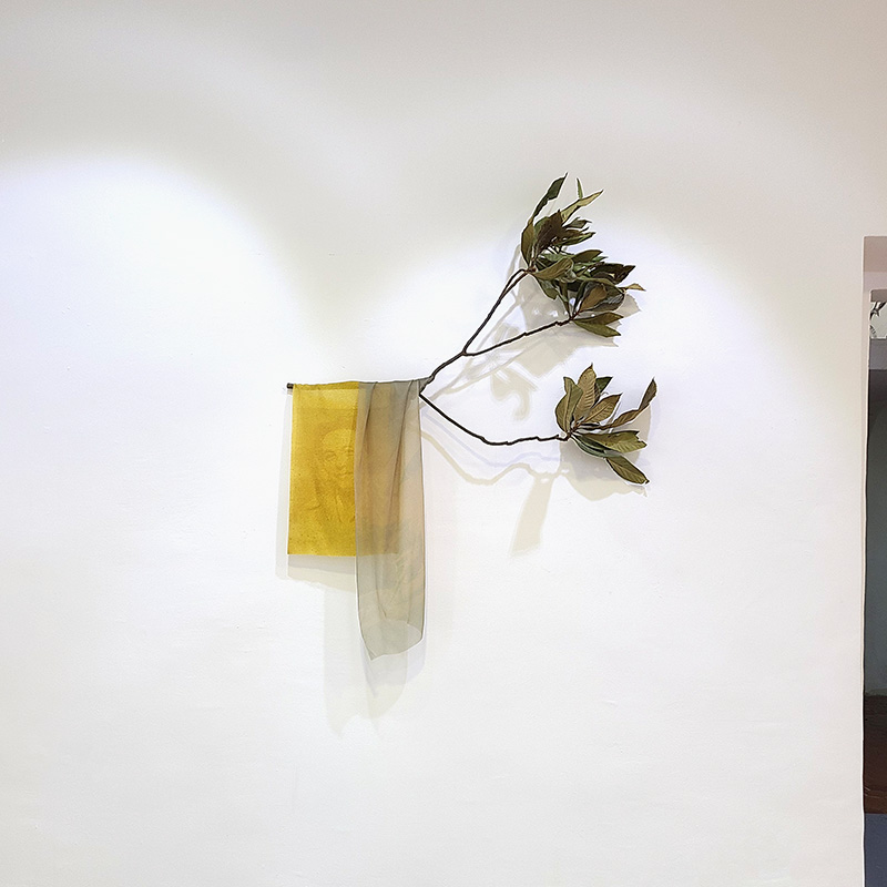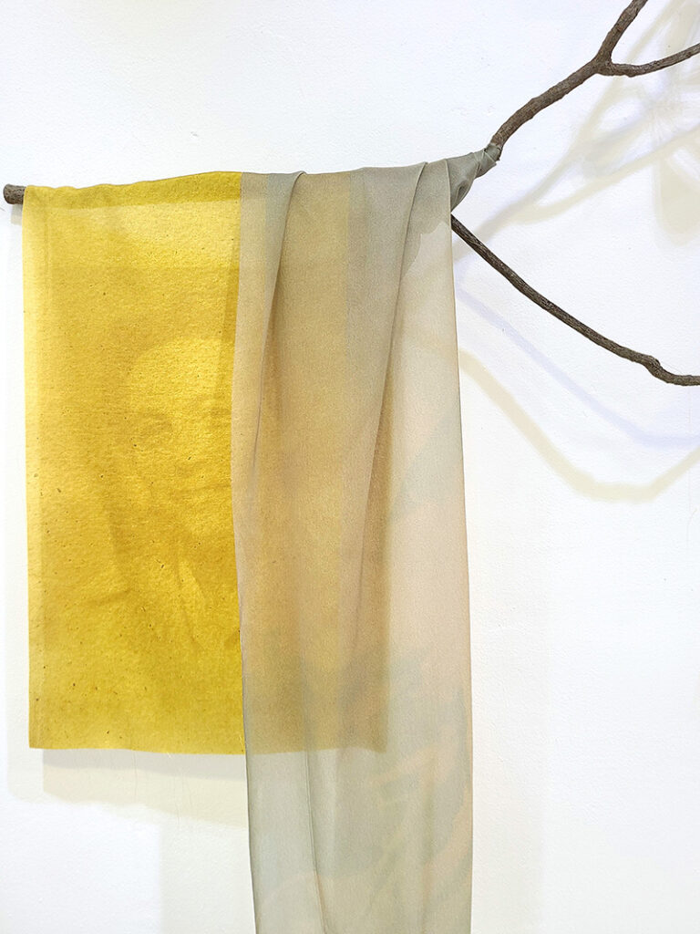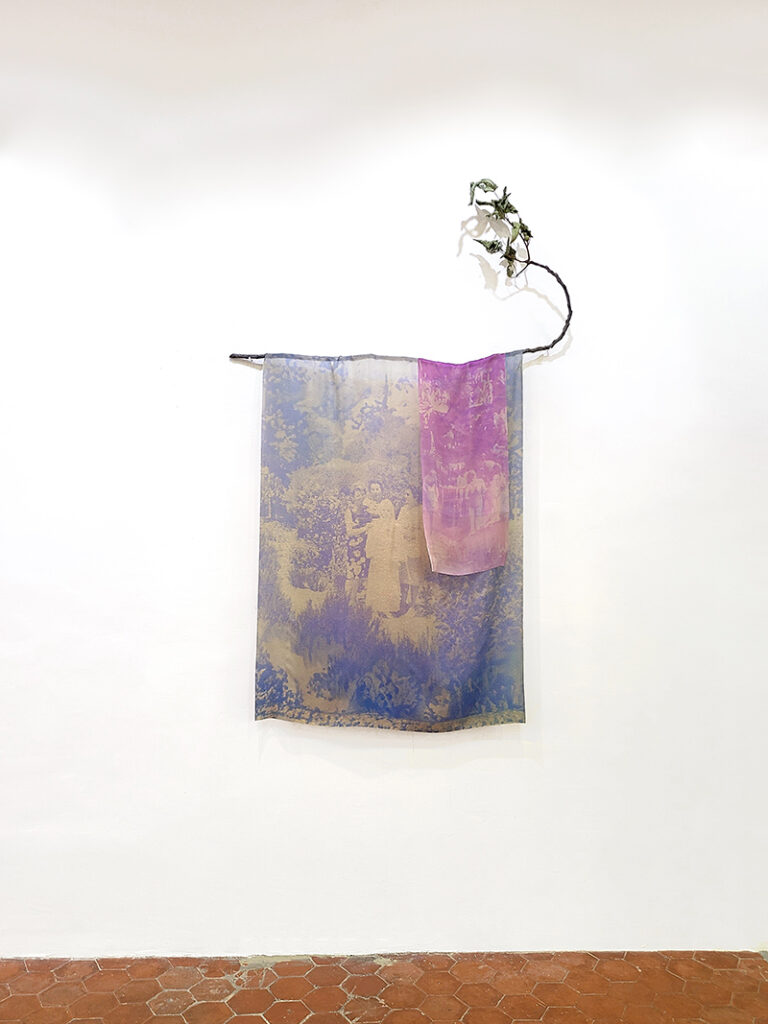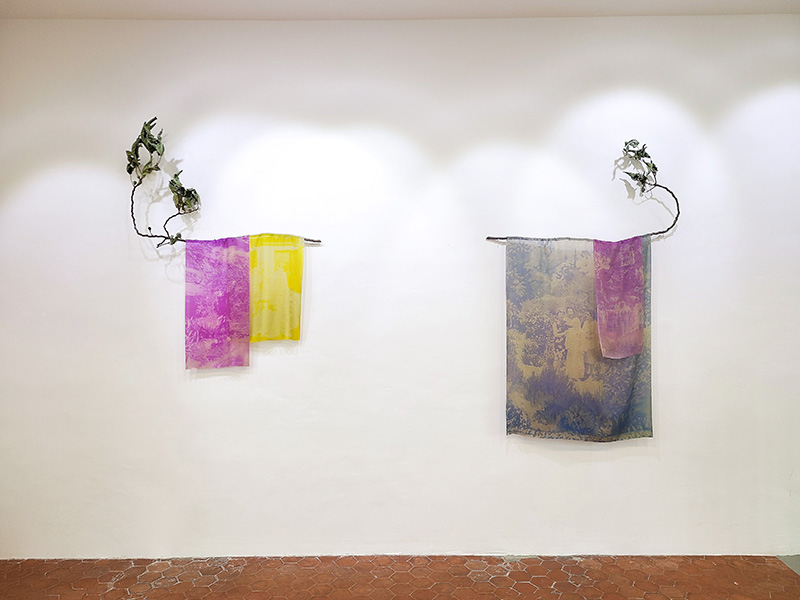 Les soies imprimées mettent en jeu un double procédé, tout d’abord artisanal par l’anthotypie, puis technologique par le développement génératif. Les images obtenues recomposent un monde à partir du fragment, un paysage de formes indéterminées semblable aux incertitudes de la mémoire. Leur couleurs proviennent des végétaux utilisés : iris, souci, géranium, glycine, canna.  Elles sont ici installées enroulées-suspendues à des branches d’arbres fruitiers, refuges des jeux enfantins, qui libèrent leur parfum estival dans l’espace.